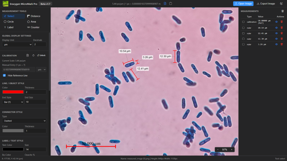 Once your analysis is done, export the image with all your measurements, scale bars, and annotations burned in. Perfect for lab reports, thesis papers, or presentations.